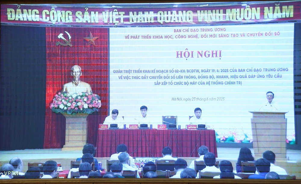 Sáng 23/6, Ban Chỉ đạo (BCĐ) Trung ương về phát triển khoa học công nghệ, đổi mới sáng tạo và chuyển đổi số (KHCN, ĐMST&CĐS) đã tổ chức hội nghị quán triệt, triển khai Kế hoạch số 02-KH/BCĐTW về thúc đẩy CĐS liên thông, đồng bộ, nhanh, hiệu quả đáp ứng yêu cầu sắp xếp tổ chức bộ máy của hệ thống chính trị. Hội nghị được kết nối trực tuyến tới điểm cầu các tỉnh, thành trong cả nước.