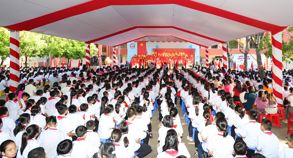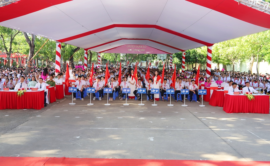 Các đại biểu tham dự buổi lễ khai giảng cùng thầy trò Trường THCS Trần Mai Ninh. |