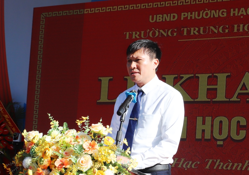 Đồng chí Dương Lê Hoàn, Hiệu trưởng Trường THCS Trần Mai Ninh trình bày diễn văn tại buổi lễ. |