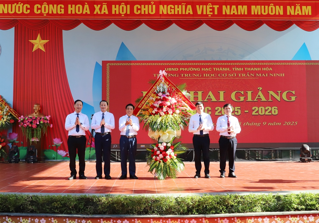Nhân dịp này, các đồng chí: Nguyễn Doãn Anh, Ủy viên Trung ương Đảng, Bí thư Tỉnh ủy; Đỗ Minh Tuấn, Phó Bí thư Tỉnh ủy, Chủ tịch UBND tỉnh; Tạ Hồng Lựu, Quyền Giám đốc Sở Giáo dục và Đào tạo đã trao lẵng hoa của Tỉnh ủy - HĐND - UBND - Ủy ban MTTQ tỉnh cho Trường THCS Trần Mai Ninh chúc mừng năm học mới.