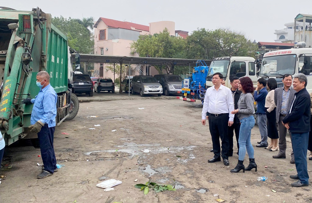 | Phó Chủ tịch Thường trực UBND tỉnh và đoàn công tác kiểm tra tình hình hoạt động thu gom, xử lý rác thải tại Công ty CP Môi trường và Công trình đô thị Thanh Hóa. |