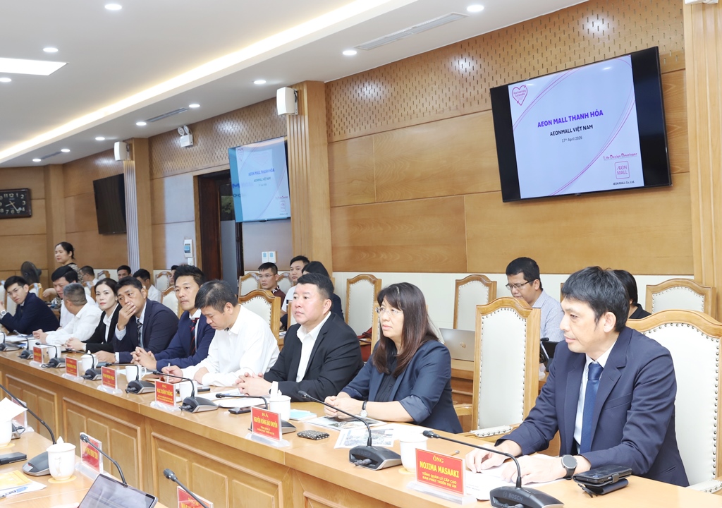 Sáng ngày 17/4/2026, đoàn công tác của Công ty TNHH Aeon Mall Việt Nam do ngài Nojima Masaaki, Tổng Quản lý cấp cao Ban phát triển dự án làm trưởng đoàn đã có buổi làm việc với UBND tỉnh về tình hình triển khai, khó khăn, vướng mắc và giải pháp bảo đảm tiến độ dự án Trung tâm thương mại Aeon Mall Thanh Hóa.